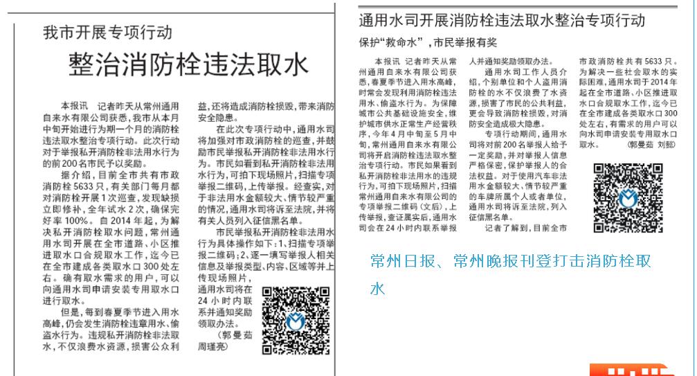 根据《中华人民共和国消防法》等相关法律规定,私开消防栓,极易对消防栓设施造成损害,一旦遭遇火情等紧急情况,影响消防栓的正常启用,危及公共安全。为在社会营造良好的保护消防栓意识,打击偷盗水行为,公司全方位多层次进行广泛宣传。专门制作了《保护消防栓,打击偷盗水》卡通动画宣传片,并在公司各个服务大厅显示屏上多次播放。还充分利用公司微信公众号连续多次推送有关消防栓知识和问答,在《常州日报》《常州晚报》《新周刊》等媒体上向广大市民呼吁爱护消防栓,从我做起,从身边做起,全民参与,全民监管,确保城市功能性设施运行正常。