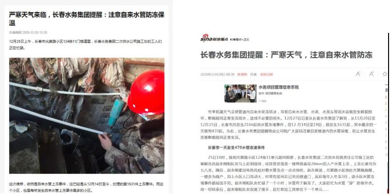 长春水务集团于11月初启动防寒保暖工作,为长春市区内300个片区4000多栋楼做了防寒保暖设施,在楼道安装棉门帘、上门弓,为窗子做密封处理,给供水管道和水表等设施进行防寒保护,防止楼道供水设施上冻。此次寒流来袭,长春水务集团首先从查漏补缺入手,开展地毯式全面排查,针对经常丢失或者遭到人为破坏防寒设施进行补缺和完善。同时,加大供水设施巡视巡查力度,每天派出200人分成11个小队进行全天候巡查。对供水管道上冻事件发生后24小时不间断处理,做到“当日冻当日解”,上冻事件不积压,日最高解冻530件,截至元旦前夕,长春水务集团共处理4087件供水设施上冻事件,顺利保障了2021年元旦期间的高峰供水。