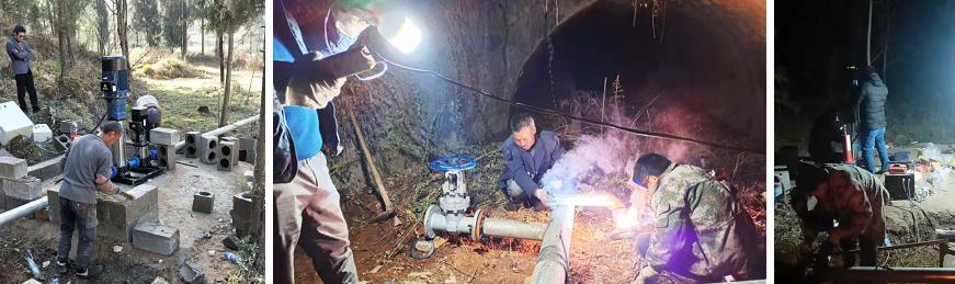 雨碌水厂应急管道泵输水建设工作于2021年2月2日8时正式开始,为缩短作业时间,提高工作效率雨碌水厂技术管理员、安装维修人员等20余名精干力量按供水应急保障施工方案,开启“铁人”模式,携带大量电机、水泵、焊机、增压泵等装备,并动用大型挖掘机1台,分三个工作面同时开展应急供水措施,沙、砖石料进场,18时许16平方米泵房修建完成。21时现场灯火通明,雨碌南水北调、安全饮水和长箐水库三条供水管网通过130米DN100镀锌管道完成管网联通工作,昼夜作战将近21个小时,随着最后一个增压泵与钢管接口的焊接闭合,施工组于2月3日清晨5时完成应急管道泵输水建设工作,6时试通水完成,小铺、水塘、小石山等水池已经过管道泵输水。