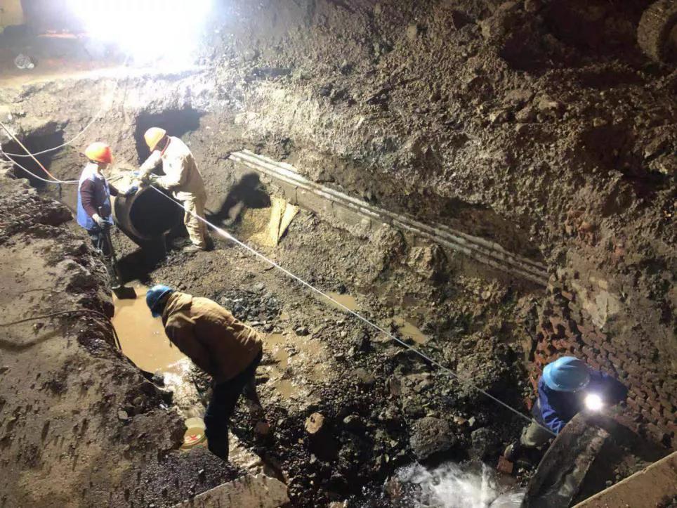 梦溪广场情况则困难许多,此处管道年代久远且为水泥管,漏损位置恰好为快车道,管道上方承载车辆较多加之长时间碾压,造成管道多处环向开裂,必须停水进行换管处理。