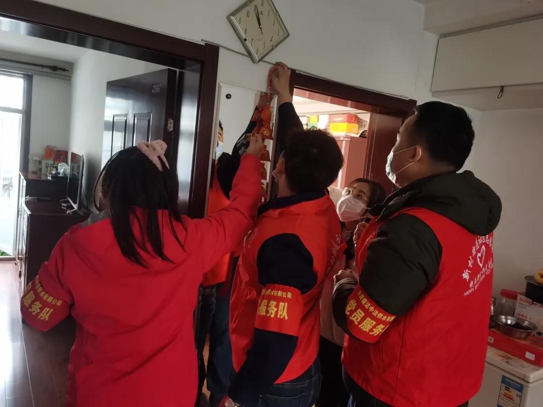 近日,塘沽中法供水公司所属供水志愿党员服务队组织队员开展“暖冬送福,喜迎新春”志愿服务活动,到驻地社区老年人家中进行新春布置。