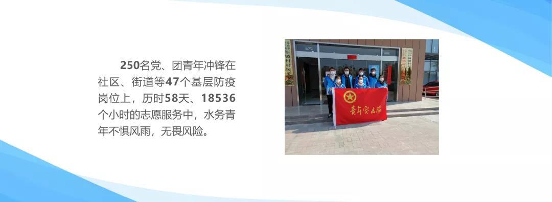 党有号召、团有行动,战“疫”志愿成为水务青年的第一战场。250名党团青年冲锋在社区、街道等47个基层防疫岗位上,历时58天、18536个小时的志愿服务中,水务青年不惧风雨,无畏风险,协助社区工作人员向社区居民宣传防疫知识,对湖北籍居民是否返乡等信息进行电话核查,在各小区门卫处认真登记进出人员信息,测量住户体温,用最细致、周到的服务,筑牢疫情防控安全屏障,为打赢疫情防控阻击战贡献了青年力量。