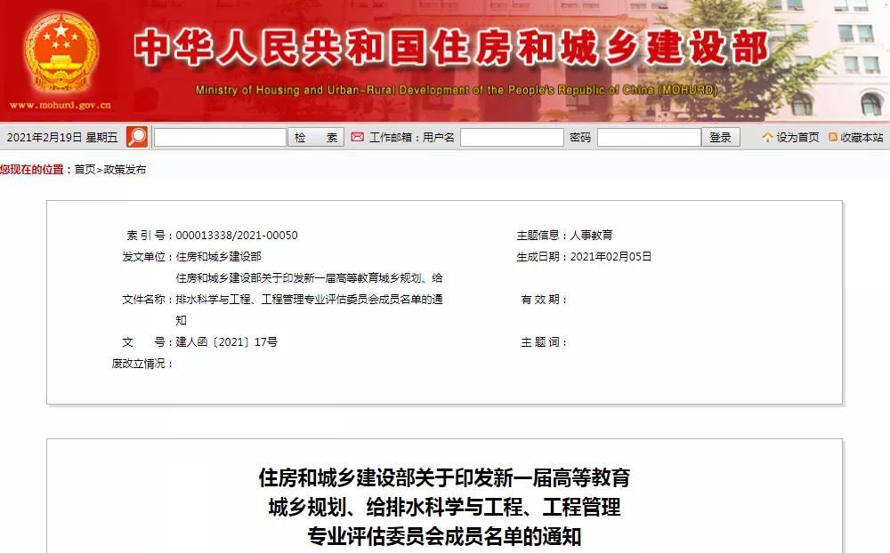 近日,住房和城乡建设部发布《关于印发新一届高等教育城乡规划、给排水科学与工程、工程管理专业评估委员会成员名单的通知》(以下简称《通知》)。