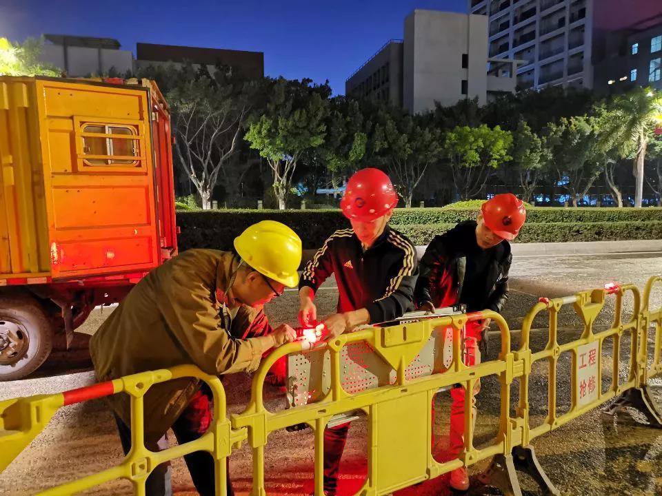 管网爆漏抢修人员正设置安全围蔽设施