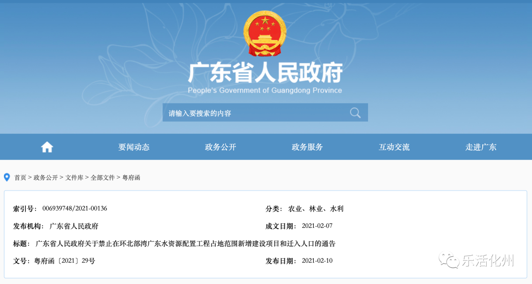 广东省人民政府关于禁止在环北部湾广东水资源配置工程占地范围新增建设项目和迁入人口的通告