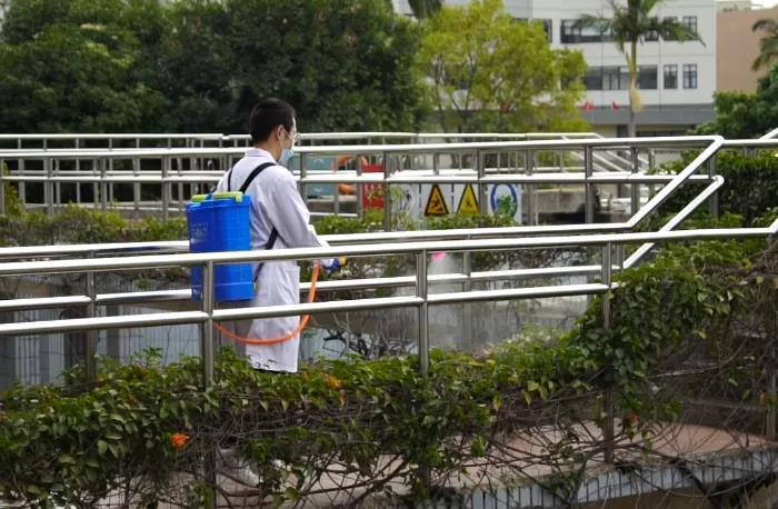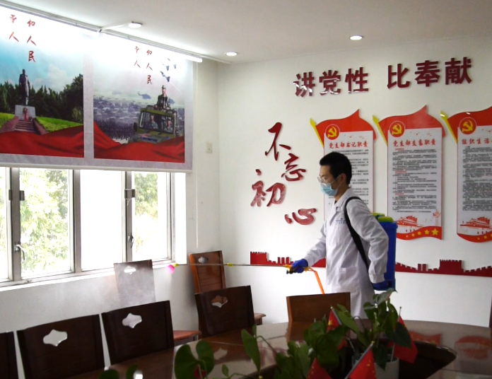 (▲对办公场所进行全面消毒)