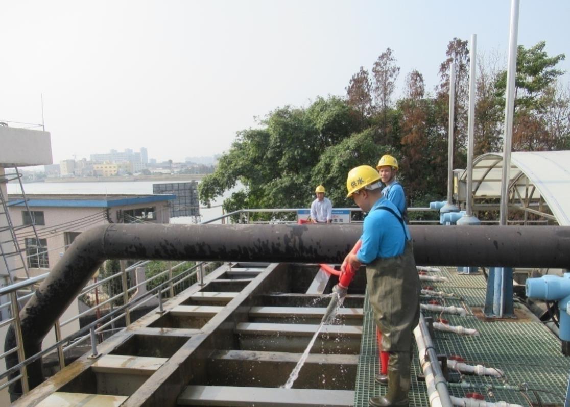 目前,南头供水公司供水(下称“南头供水”)一厂的日生产能力为2万立方米,内设反应系统、沉淀系统和集水过滤系统等功能区域,含有沉淀工艺和气浮工艺相互转换功能的设施设备。厂区对自来水的日常净化处理过程中,每隔24小时会对沉淀池的底部进行排泥处理,由于反应池、沉淀池空间小,设备多,制水生产长期运转,使得池底以及斜管等地方出现淤泥沉淀,同时刮泥机也因长期运行增加了老化和故障风险。在春节到来前,南头供水厂未雨绸缪,对全厂设备进行检修和维护,重点对供水一厂内的刮泥机和排泥阀进行维修保养,并对反应池、沉淀池进行了全面清洗。