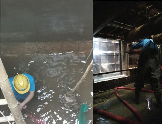 此次清洗工作主要针对反应沉淀池中的底泥、斜管、以及池壁表面的附着物进行清理,由于池体较小,设备结构较为复杂,为此采取人工清洗方式开展清洗工作。清洗过程中,厂区工作人员不怕苦不怕累,任劳任怨,加班加点,互相配合,充分发挥团队合作精神,保质保量完成了本次清洗维护任务。不仅如此,南头供水对厂区内一级泵房、二级泵房以及一厂仪表间、应急室的地面,基座等区域进行“亮化”工程,刷地坪漆,使供水厂面貌焕然一新。