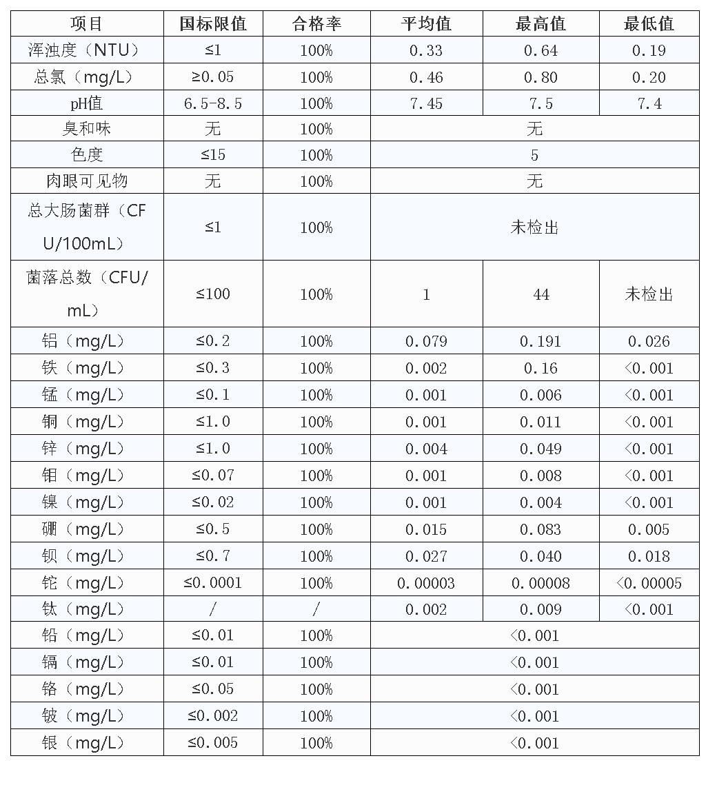 以2020年检测的200户家庭水质样本结果为例,居民家中的水龙头各项水质指标合格率均达100%。具体检测结果如下表所示: