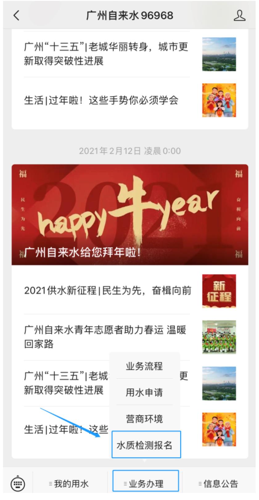关注【广州自来水96968】微信公众号,绑定用户编号,在【业务办理】-【水质检测报名】栏目报名免费体验水质上门检测服务。