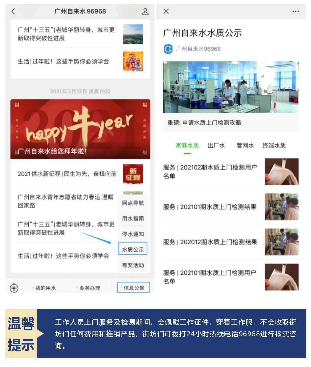为保障检测服务的优质高效,广州自来水公司将综合考虑用户区域、供水设施等因素,每月抽取并微信公布20名用户(2021年6月起为每月30名)预约开展上门检测,街坊们可留意官方微信信息动态【信息公告】-【水质公示】栏目,查看当月成功选取的名单。上门检测前,公司工作人员会通过短信或电话预约用户。