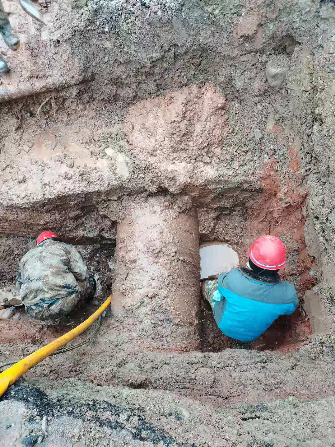 乌鲁木齐水业集团天山区供水公司和应急抢修中心的维修人员们来不及吃午饭,立即展开现场抢修。由于地下设施复杂,开挖空间小,供水管线旁边有燃气管线,上方有电力管线,给抢修带来了很大困难。而此时天公不作美,下起了大雪。越下越大的雪夹带着风,抢修人员顶着零下15℃的严寒作业,经过几个小时的奋战,终于安全挖出DN800管线,确定漏点为套袖铅口处。直到此时经理张荣贵和副经理艾斯卡尔紧锁的眉头才舒展开,两颗悬在嗓子眼的心才放下,他们相互对视一眼,长舒了一口气,会心一笑,欣慰的说:“这次维修不用关闭大阀门,不会影响到市民用水了。”说完,就立即现场指导抢修人员清理出工作面,将漏水处铅口夯实止漏。