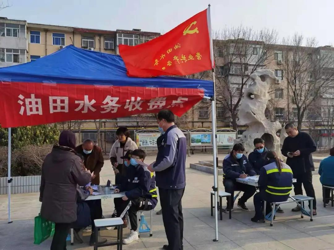 与此同时,新盛小区门口人声鼎沸。油田水务党支部、营业党员服务队、团支部,联合农行港中支行党支部于新盛小区服务点开展现场收费、服务卡发放及水表水费问题答疑活动。