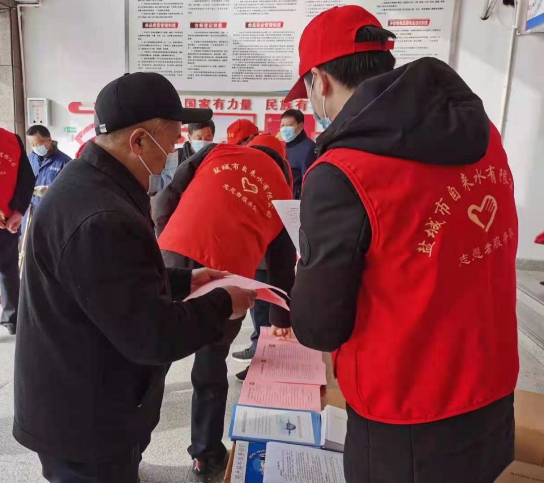 在鹿鸣路市场,公司青年志愿者们穿着鲜红的志愿服,头戴鲜红的志愿帽穿行其中,与社区工作人员一起清理环境卫生,热情地向市民发放公司服务指南,提供水质、水压等用水服务咨询。并根据新冠肺炎疫情防控情况,向居民发放疫情预防宣传小手册。活动中,青年志愿者们还为有需要的居民进行供水设施义务检修,让大家感受到了盐城供水人的贴心服务,受到了广大市民的一致好评。
