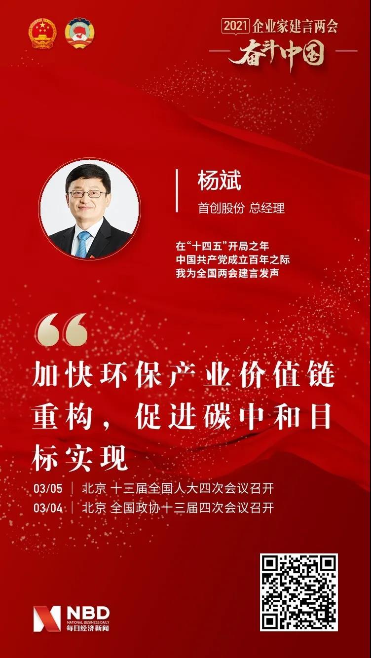面对碳中和的新目标和“十四五”的新起点,首创股份积极建言献策,展现环保企业应有担当。在今年两会上,首创股份总经理杨斌提出,“十四五”是我国迈向碳中和的关键时期。环保行业天然具有绿色低碳属性,将迎来新一轮产业价值链重构升级的新机遇。