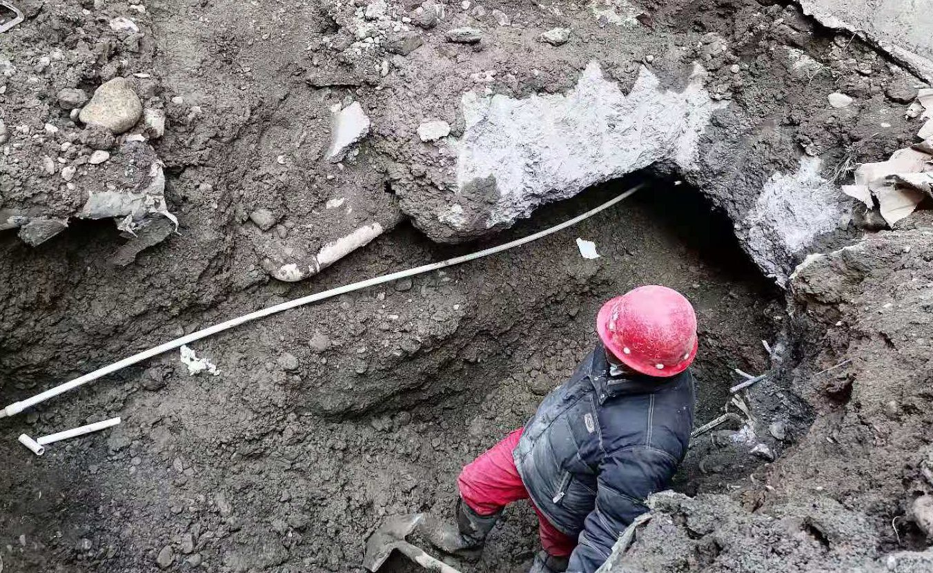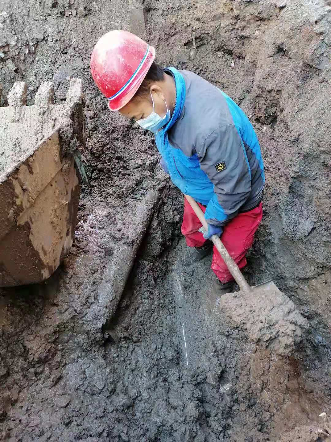 因担心继续机械开挖会破坏管道,只能采用人工清掏的作业方式,乌鲁木齐水业集团应急抢修中心的抢修队员在满是泥浆的泥坑中,一点点手工清掏淤泥,出现在眼前的是一个近2米的深坑,深埋地下的PE32管线终于出现了,通过清理管线发现管道有一处破裂点正在漏水。苏斌告诫大家:“我们不能放过任何一个可能性,如果疏忽了别的漏点,会使我们前功尽弃,导致抢修任务失败。”在苏斌的坚持下抢修队员们又沿着管线继续扩大基坑,一定要将隐藏的“大麻烦”彻底找出来。在大家的不懈努力下,在近6米长的PE32管线上一共出现了3处裂口。