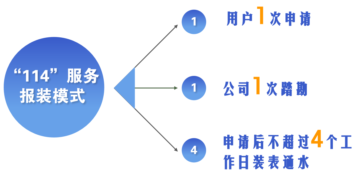 全面推行“114”服务报装模式,即用户1次申请、公司1次踏勘,申请后不超过4个工作日装表通水,为接水用户提供从技术咨询到装表通水的“一条龙”式服务。同时,3月1日起用户接水成本大大缩减,供水服务范围内用户接水,红线外接水费用全部由公司承担,用户只需承担红线范围内部分费用,真正实现让利于民。