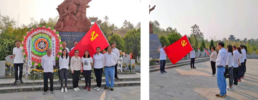 在庄严肃穆的“革命烈士纪念碑”前,怀着对先烈们的崇高敬意和无限哀思,全体党员默哀一分钟,敬献花圈,并对着鲜红的党旗重温了入党誓词。