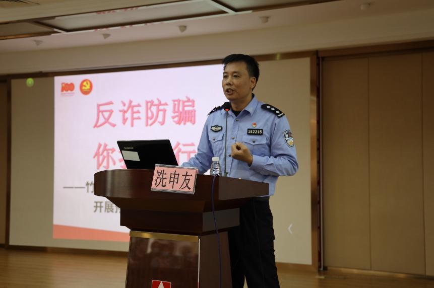 在党史学习教育宣讲会上,竹苑派出所民警冼申友为与会人员进行了题为“反诈防骗,你我同行”宣讲。民警冼申友同志通过结合实际案例讲解在冒充客服退款诈骗、网恋交友诈骗、网络贷款诈骗、刷单诈骗、虚假购物诈骗等常见方法和手段,进一步提高了党员群众防范电信诈骗的安全意识。