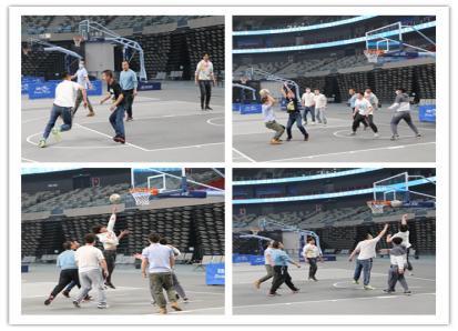 在讲解员的带领下,大家先后对奥体中心内的综合体育馆及全民健身馆进行了参观。其中,综合体育馆作为一带一路新丝绸之路经济带上规模最大、硬件设施最先进的综合体育场馆之一,拥有着亚洲最大的中央悬吊LED高清斗屏,最先进的全景式LED灯光照明组,置身于此,我们的篮球爱好者们怎能不上场一展身手呢!一场新市区供水公司对战水区供水公司的4人半场篮球赛将本次活动推向了高潮,这场比赛中没有裁判,没有胜负,有的是各民族同胞之间的相互配合、相互协作,在激烈的比赛中让我们深切地感受到了什么是像石榴籽一般紧紧拥抱在一起的情谊。