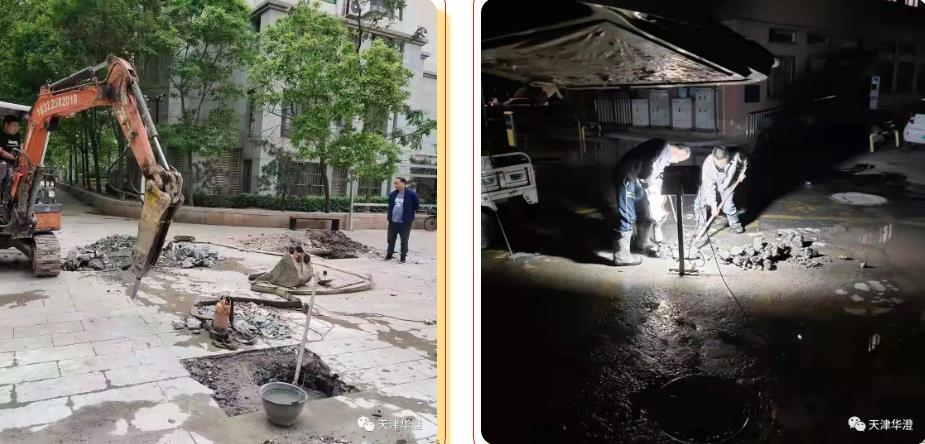 5月3日7时,二次供水热线客服中心接到报修电话,位于南开区平祥大厦小区高层区域的自来水地埋管道漏水,造成300余户家中停水。抢修人员接到指令后立即赶到现场,经过排查发现是由于地埋管道老化严重造成的停水,现场路面有多处漏水点。因漏水点位于小区石材路面下,混凝土垫层厚度约30cm,给基坑开挖带来了很大难度。在勘查现场情况后,抢修人员立即调派挖掘机进行基坑开挖,同时联系热线人员查阅档案图纸确定破损管道规格,调配抢修所需的管件材料。