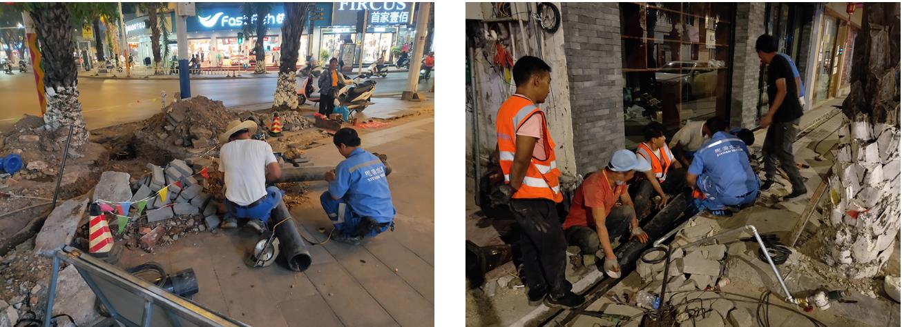 整体施工由安装维修部门经理统一指挥调度,所有施工材料、机械设备、人员提前到位,运用简单器械设备加人工二合一模式进行开挖,但随着天色渐暗,大大增加了安装作业的难度及危险系数。在这样困难的环境下,施工人员不畏艰难,默契配合,通过清理、打磨、修边、安装哈夫节,终于在次日凌晨6:54试通水,及时恢复了该区域居民的正常用水。