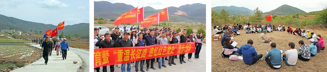 鲜红的党旗迎风飘扬,浩浩荡荡的队伍穿行在乡间小路、田野村庄,尽管天气炎热、山路崎岖,参加活动的党员青年依旧怀着对红军的敬仰阔步前行。