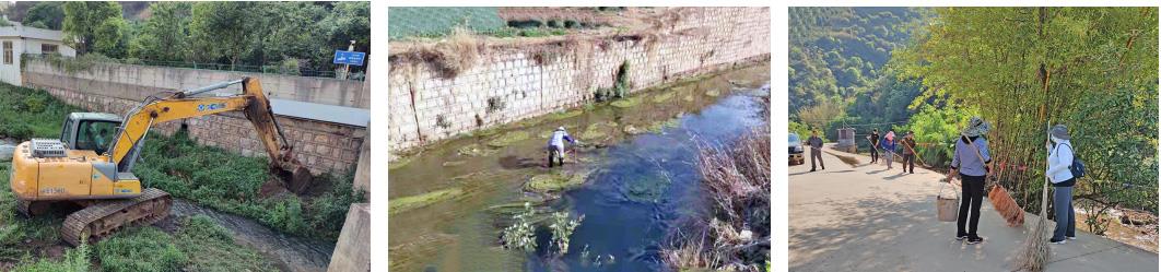 截止目前,投入挖机1台,出动人员20余人,清淤400余米,清运水域垃圾、杂草等2吨左右。