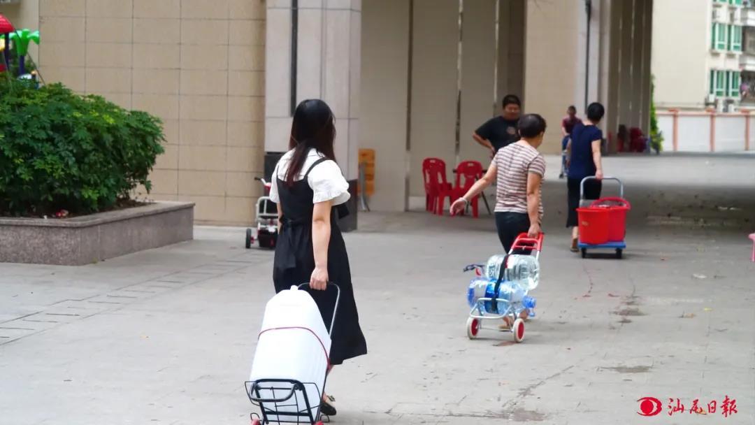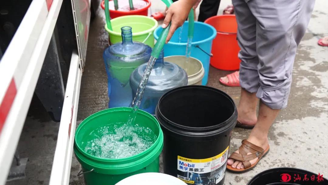 近段时间,水桶成了海丰县城的热销用品,大大小小的水桶堆放在商铺面前,买水桶的人络绎不绝。在集中供水点,市民刘先生正准备把一个硕大的水桶提回家,桶里面装着刚刚从运水车上抽出来的水。“我们小区没有电梯,提着这一桶水上6楼累得我气喘吁吁。”刘先生说。