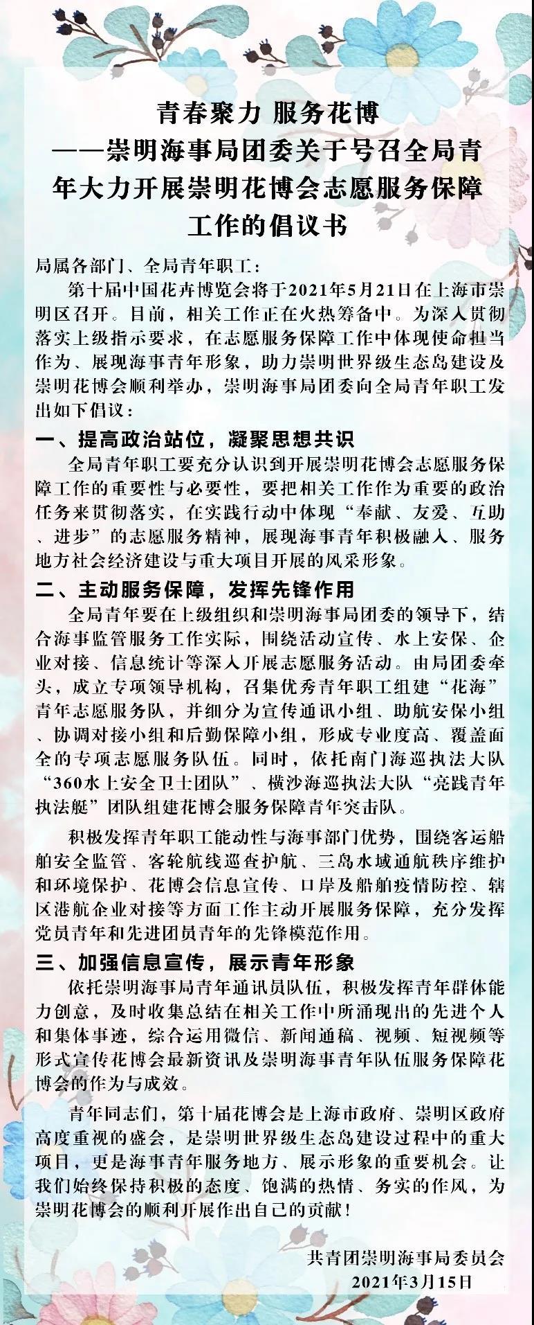 为深入贯彻落实上级指示要求,助力崇明世界级生态岛建设及花博会顺利举办,展现海事青年良好形象,体现建交青年担当作为,上海崇明海事局团委向全局团员青年发出青春倡议:
