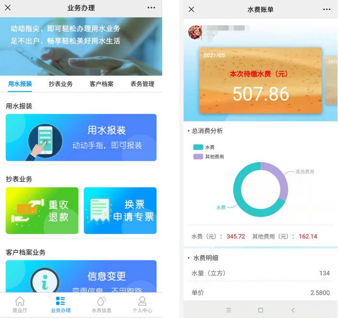 在香格里拉市供排水公众号掌上营业厅,用户绑定户号后可查询水量、水费信息、缴纳水费的线上一站式服务,还可实时了解停水公告、水质公告、用水百科、营业网点、业务指南等相关用水信息。足不出户办理用水报装、水表过户、用水性质变更、手机号码变更等相关用水业务。目前,掌上营业厅已实现用户信息认证人脸识别,为确保用户信息真实可信,全面启动水务微信服务平台与公安部系统服务管理平台联网对接,实施联合监管。