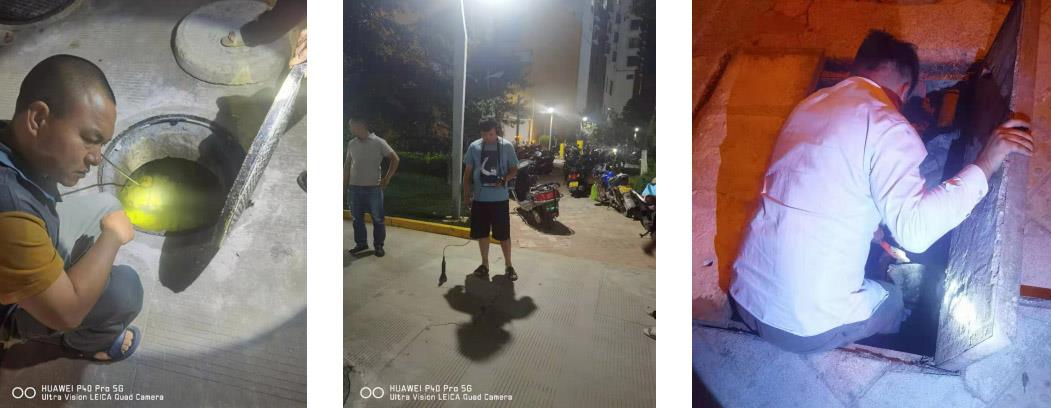 接到求援后,临翔城市供排水公司领导班子高度重视,立即分析原因,排除爆管可能后,迅速组成党员+技术骨干的探漏队伍,由供水工程部部长周宗东带队,于当晚11点到达产权并不属于公司的玉龙花园小区,对小区一、二片区供水管网、水表、阀门、排水井盖进行拉网式排查,对埋藏地下的供水管网用听漏仪、听音管仔细探听,越是隐蔽的阀门井越是不放过,再重的井盖都一一打开,夜多黑,也火力全开、毫不懈怠!经过3个多小时的挑灯奋战,在玉龙花园5栋、15栋查出暗漏点,漏点破损较大,每小时漏水约10方。为能尽快修复暗漏点,公司党员先锋队多角度、全方位给予小区技术指导。