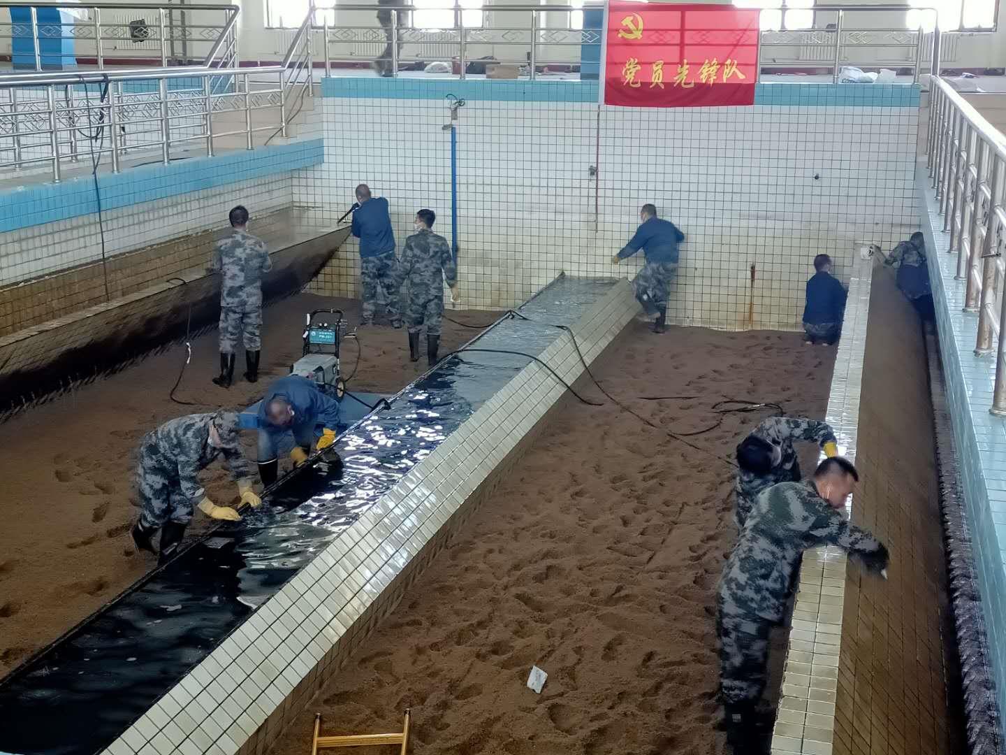 根据工作方案,生产运行部职工首先将滤池排空,随后各个党员身着皮衣皮裤,换上防水服,水靴,戴上劳保手套进入池底,他们有的手持高压水枪不断冲洗着池壁的泥垢;有的手拿刷子一点一点地擦拭附着在池壁上的青苔和淤泥;有的随时待命为他们递上所需物品,对运行了一冬天的池子进行清洁。