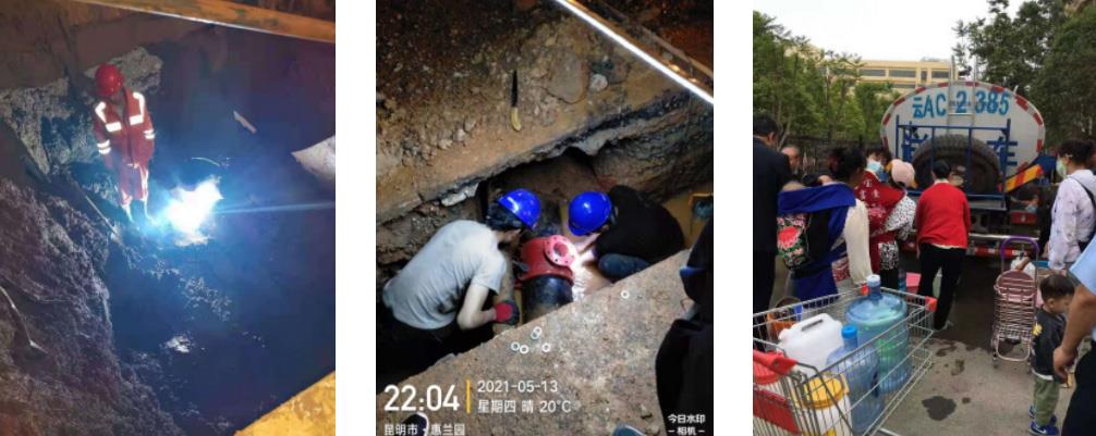 2021年5月13日、14日下午,清源公司服务片区内连续发生两起第三方损管及一起主供水管道自然漏损事件。接报后,清源公司抢修人员30分钟内赶到现场勘查,为保障人民群众正常用水,清源公司高度重视,一方面迅速安排应急送水车辆备班,另一方面紧急制定切合实际的抢修方案,为了不影响用户高峰期用水,抢修人员在对损管现场作简单处置后,决定把正式停水抢修时间安排在夜间进行,并尽可能带水作业,最大限度减小管网停水抢修给用户带来的影响,抢修人员克服了夜间施工开挖难度大,风险较高的实际,机械与人工配合开挖,在淤泥中交替作业,三起供水管道漏损事件均在次日凌晨6时前完成抢修工作,恢复供水,基本没有影响到片区用户正常生产生活用水。