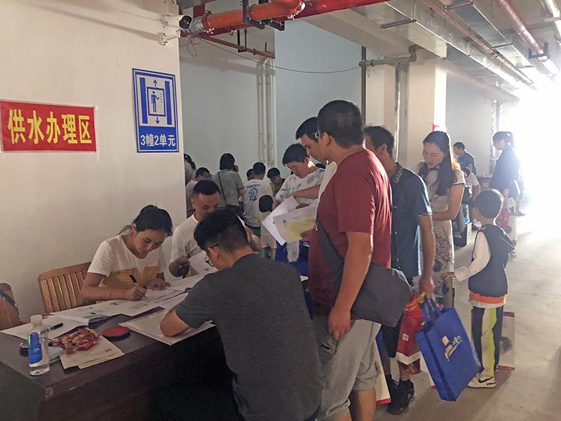 为配合华发悦庭小区顺利交房,通海县供排水公司主动出击,深入贯彻落实“一站式”服务,于5月22日至23日在小区交房现场设置业务办理工作点,为用户办理《供用水合同》签订等用水申报手续。