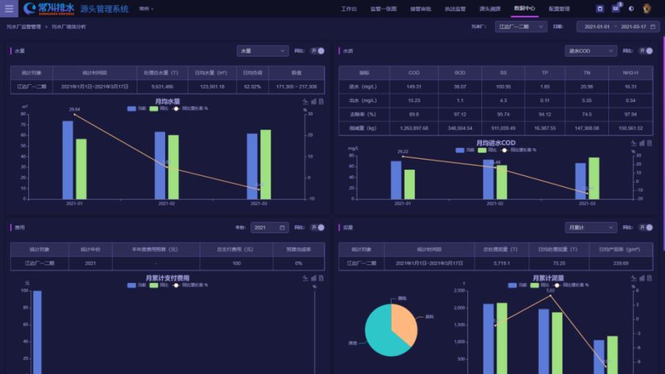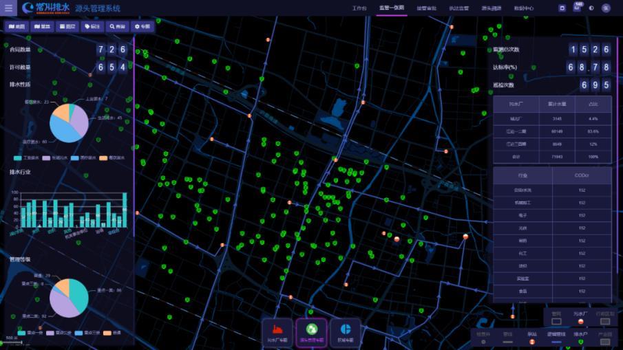 打造“能上能下”的平台运营模式,实现系统化综合管控,本系统涉及的源头管理业务范围涵盖污水处理厂4座、泵站163座、雨污水管道3000余公里、接管企业1800余家,各类设施资产、水量及水质数据分别集成在已有的不同系统中,本系统将多来源、不同格式、不同空间尺度的数据进行统一集成,既能向下对接已有系统的监测数据,又能向上对接至本系统平台各项业务模块进行应用。