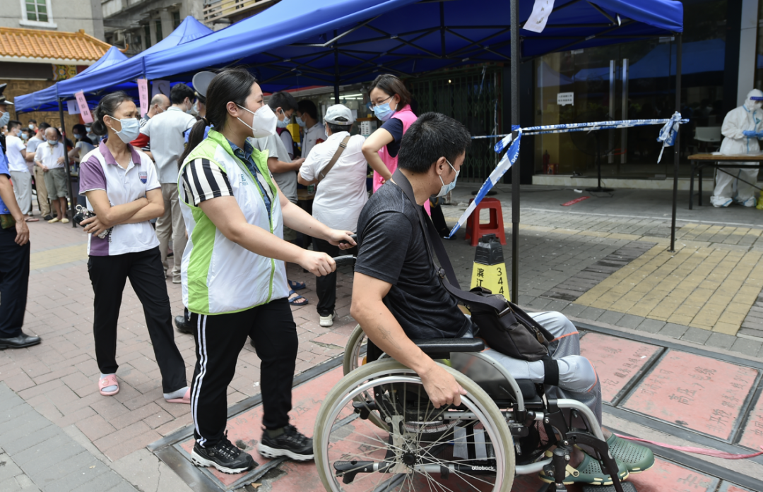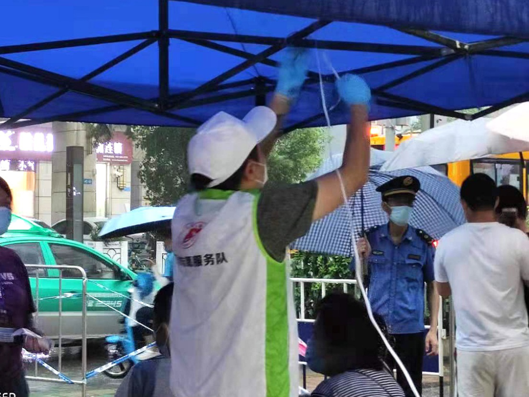 下午,一场突如其来的“龙舟水”倾盆而下,突击队员迅速引导现场市民进行避雨,并协助医护人员做好雨棚和物资保护工作。面对炎热与暴雨天气的双重考验,突击队员不辞辛苦,尽职尽责,坚守在社区核酸检测现场。