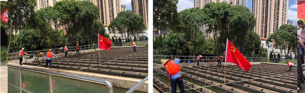 昆明市被全国爱卫办正式命名为国家卫生城市之后,又通过了全国爱卫办组织的国家卫生城市两次复审,今年全市迎接国家卫生城市复审工作已经到了决战决胜的关键时刻。5月28日,几天的阴雨天后又是烈日炎炎,五支部党员示范岗的党员、团员为助力2021“创卫”冲刺工作,在保障供水稳定的前提下展开了如火如荼的沉淀池大清洗劳动,救生衣、清洗机、刷子、高压水枪、捞网这些工具已经在日复一日的熟练操作下被大家舞得“虎虎生风”。热吗?哪及得上我们火热的工作热情。累吗?看看干净的沉淀池、清澈的工艺水,心里的满足可以冲淡一切。