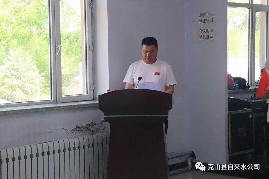 公司总经理张志钢在活动的开幕式上作重要讲话,他指出,克山水司向建党百年献礼活动是以“学党史、促发展、保供水、树形象”为主题,以党的群众路线教育实践活动为契机,通过唱红歌、知识竞赛、重温入党誓词、为群众办实事等多种形式,激励全体党员及广大职工在实际工作中发扬党员的先锋模范作用,让供水事业的发展在党的阳光指引下,开拓创新、与时俱进,为祖国的繁荣昌盛,为克山的富裕文明,为社会的和谐发展创造出更辉煌的业绩。克山县自来水有限责任公司将以“保障供水、服务民生”的优异成绩向建党百年献礼!