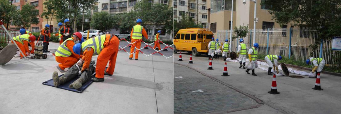 在雨天防汛抢险演练中,针对冒溢点,作业人员及时更换透水井盖查看具体冒溢情况,分为放置交通锥、疏导行人及车辆、捆绑防洪袋三个小组,在做好现场防护措施的前提下,完成了防汛抢险演练;在受限空间作业演练中,模拟了工人作业过程中不慎跌入井中,开展应急救援工作。演练中作业人员严格按照“先通风、再检测、后作业”的要求,熟练地进行作业前准备,在接收到气体检测仪的报警后,利用送风机进行通风排气,随后作业人员穿戴好安全帽、安全绳、安全带、反光警示背心等防护用品,进入井下开展救援工作,最后利用三角架成功解救出被困井下人员,顺利完成受限空间作业演练。