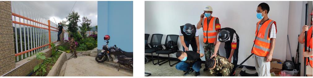 演练内容:场景模拟1:有2人可疑人员翻墙进入厂区药品间偷盗药品,被正在值班的保安在监控中发现,保安立即报告厂区领导小组有可疑人员偷盗药品并报警,应急领导小组接到报告后,立即响应《金平永益供水有限责任公司城市供水系统重大事故应急预案》,按照方案分工到达各自岗位,指挥长李永生下达命令控制2名可疑人员并报警,副指挥长柏建平带领安保组组长邓成付及成员立即控制可疑人员。