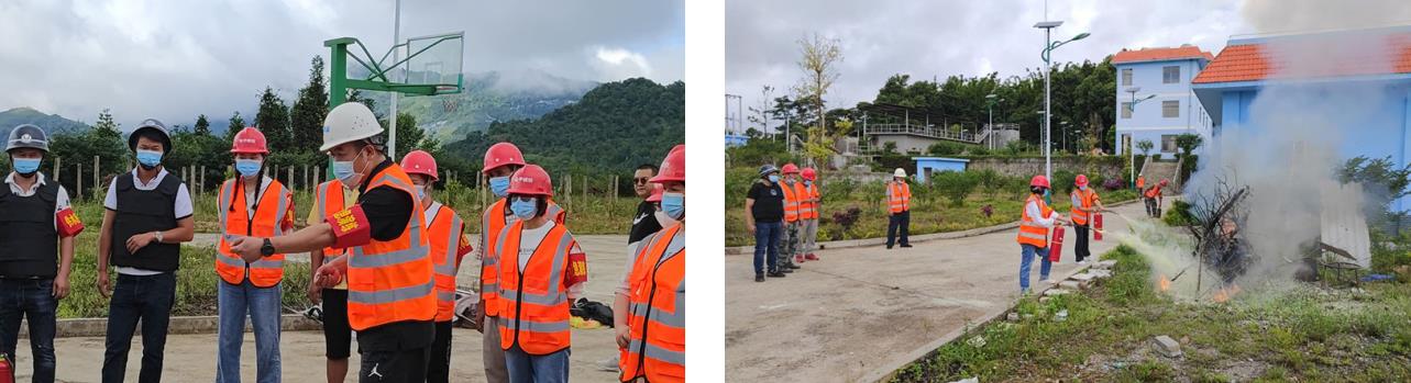 场景模拟2:在岗人员在厂区内发现火情后,立刻报告应急领导小组并快速使用灭火器灭火,火点熄灭后再检查是否有复燃。