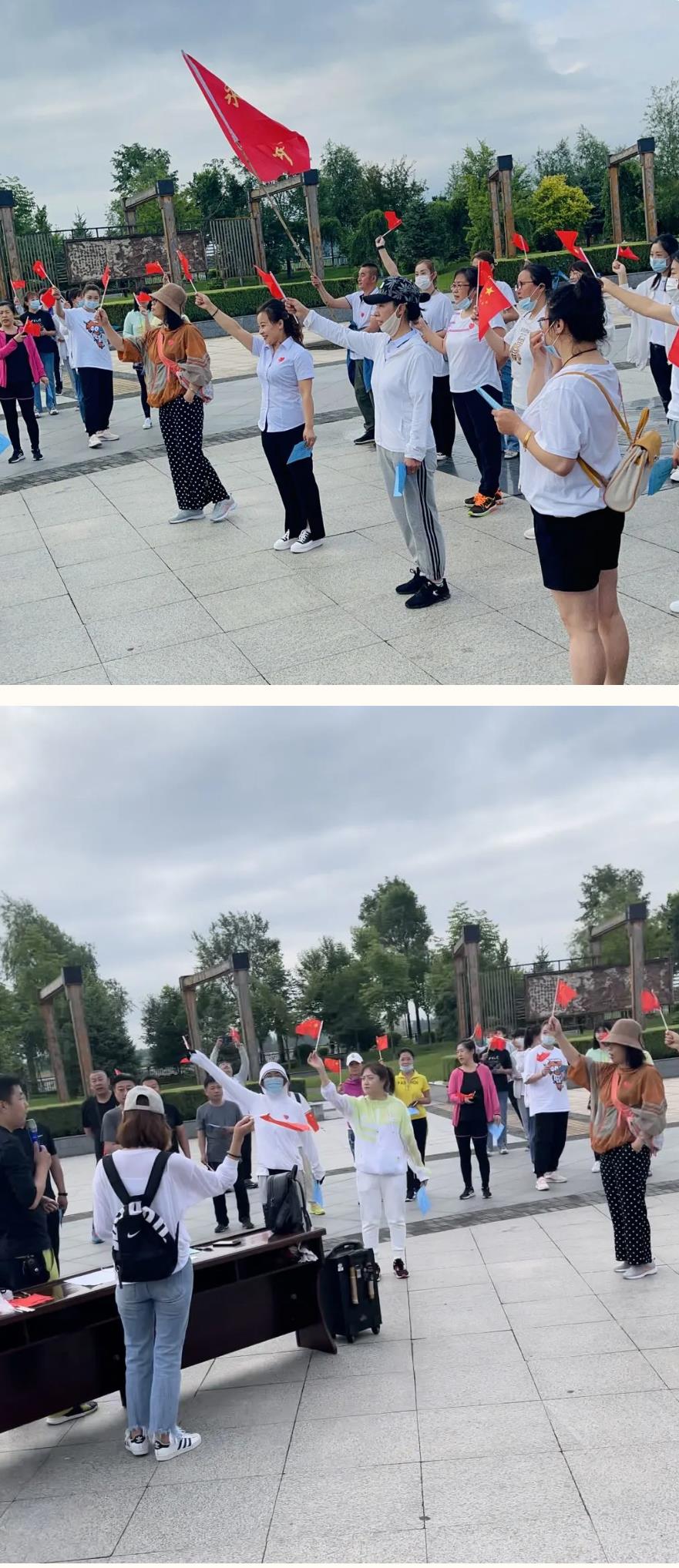 早5时30分,阿什河公园的金太祖广场上散步的居民慢慢多了起来,一段慷慨激昂的旋律《没有共产党就没有新中国》从“埋伏”的音响中传扬开来。大家纷纷从四面八方走到广场中心,深情共唱抒发对祖国、对党由衷地热爱。用实际行动为建党100周年献礼。