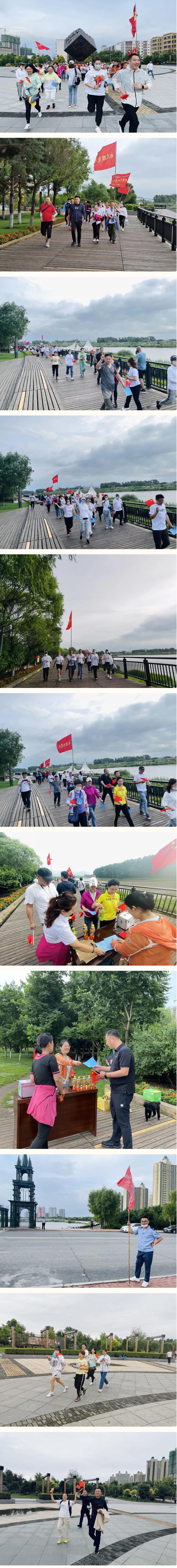 歌曲结束徒步大赛正式开始,徒步中职工们个个精神饱满,意气风发,富有朝气活力,他们步伐矫健,行动敏捷,按着规定路线你追我赶,互相加油鼓劲,沿着美丽的阿什河前进,在栈道尽头折返,最终返回终点金太祖广场,全程4公里。为保证职工们正常比赛,沿途折中点设立了补给站,同时在有车辆通过的位置安排专职安全员查看行车情况以保证徒步行程安全。