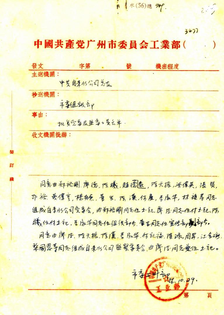 1949年10月广州解放后,广州市军事管制委员会派军事代表接管了广州自来水,并成立自来水管理处党支部
