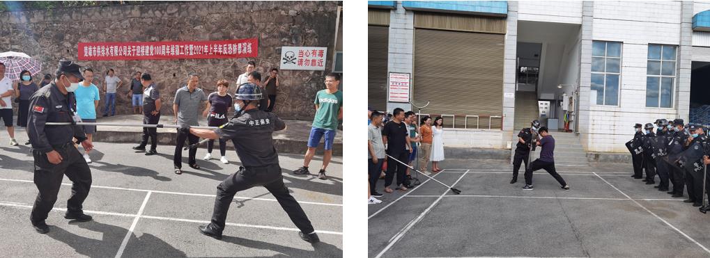 为切实做好建党100周年维稳工作,进一步提升保安队伍反恐防暴能力,全面提升公司突发事件应急处置能力,2021年6月21日上午,楚雄市供排水公司在观音山水厂组织开展了迎接建党100周年维稳工作暨2021年上半年反恐防暴演练。楚雄市供排水公司、楚雄中正保安服务有限公司共同配合完成此次演练。