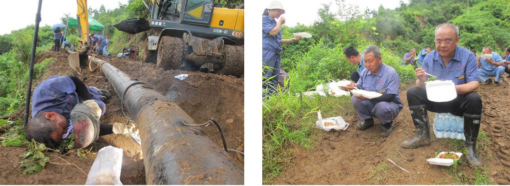 灾情发生后,富宁县供排水公司立即启动供水应急预案,派出四个供水管道排查小组,一组到水源头关闭取水管道闸阀,二、三、四组分三段排查被冲毁的引水管道。通过排查,发现有四处供水管道被冲毁,其中有两处受损严重,管道断裂40余米。灾情查实后,公司立即组成三个抢修小组,组织材料、机械、用具奔赴抢修现场,通过十余小时的全力抢修,于6月30日下午18时20分完成抢修任务,恢复供水。此次洪灾造成腊拱水源供水中断31小时。