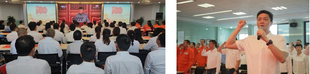 2021年7月1日上午,党中央在北京天安门广场举行庆祝中国共产党成立100周年大会,习近平总书记发表重要讲话。通用水务党委认真组织开展庆祝中国共产党成立100周年活动。公司领导班子全体成员、各支部书记、党员代表100余人在公司总部六楼会议室,其余党员及干部职工于就近会场认真观看了大会盛况,对当天在岗不能集中收看实况的党员干部职工,通过手机在线和收听广播的形式收听收看了实况。庆祝活动中,党委书记毛瑜带领全体党员重温了入党誓词,齐声合唱了《没有共产党就没有新中国》。