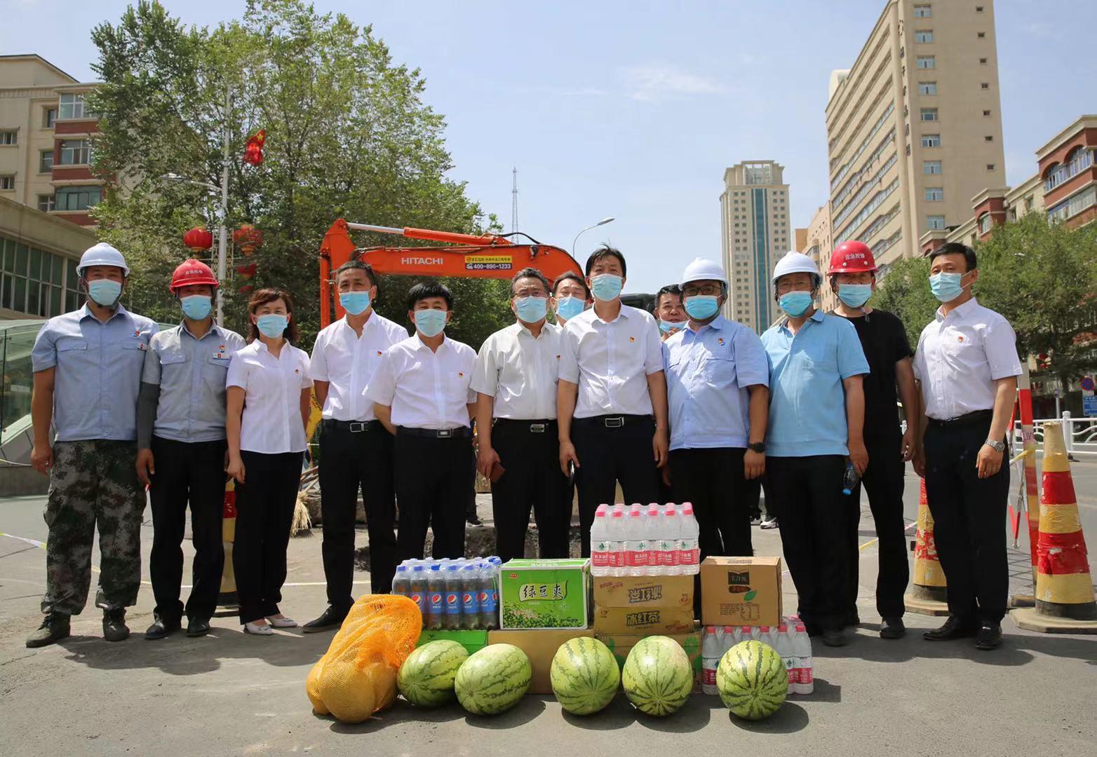 连日来,高温阵阵,酷热难耐,在乌鲁木齐市轨道交通2号线碾子沟站DN700给水管线迁改碰接施工现场,乌鲁木齐水业集团党委委员、总经理梁新育和集团公司党委委员、副总经理王建新、韩旭、谢东及组织部(人力资源部)、办公室、集团公司工会等部室负责人看望慰问奋战在供水改迁抢修一线的职工,为他们送去了消暑降温的西瓜、饮品等慰问物品,让在抢修一线的干部职工感受到集团公司党委的关怀。随后,总经理梁新育一行人又步行前往二十二小学抢修中心阀门更换现场,现场查看阀门更换情况,并对现场施工负责人做了相应要求。