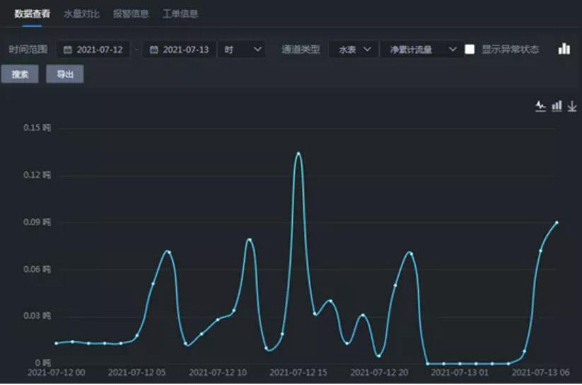 他们立刻进入智能水表计量云平台进行数据分析,发现12日凌晨0-4点,蔡爷爷家的用水量高达13升∕时,“这个时间段按理是不会产生水量的啊,估计有漏水情况!”